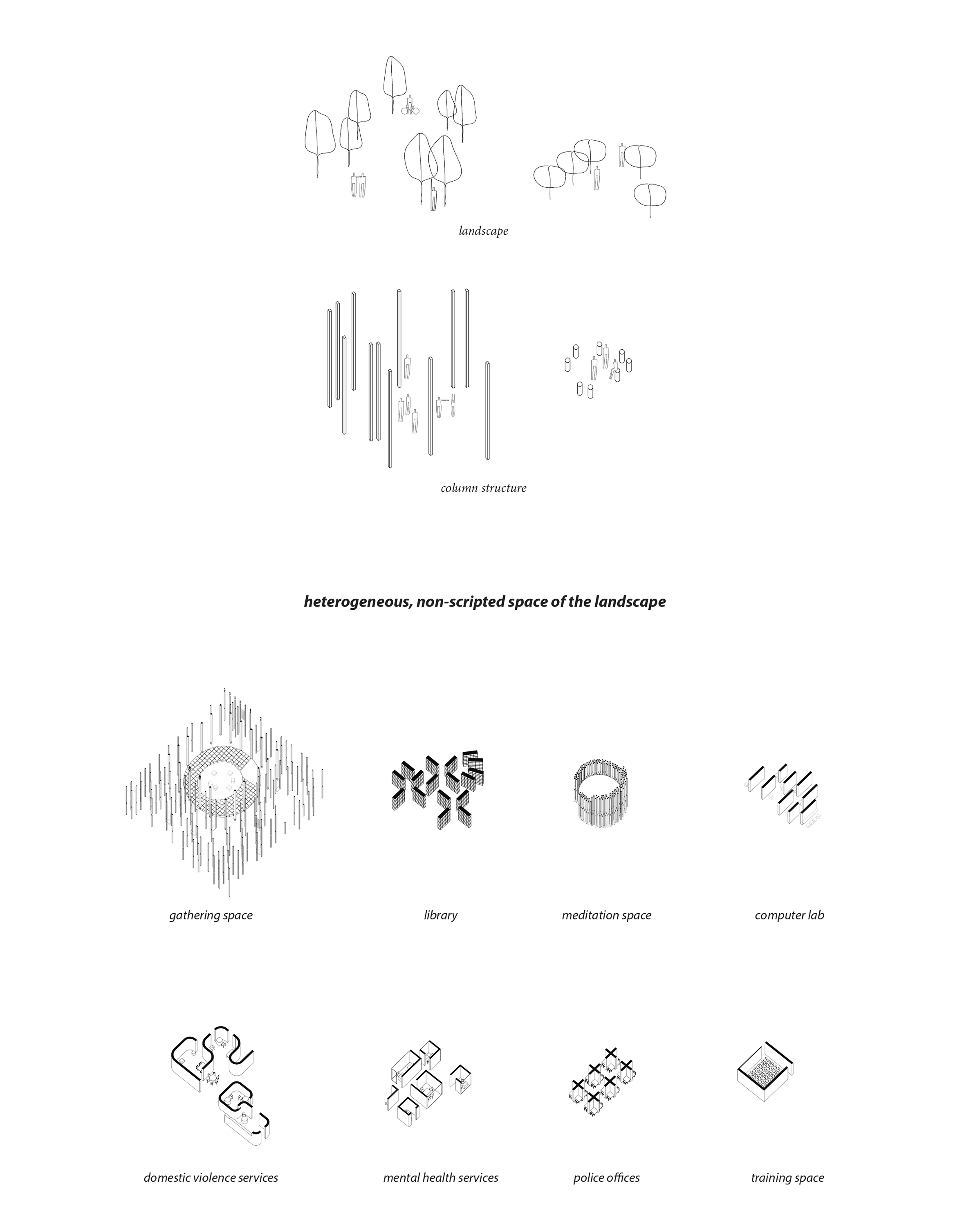 The project embodies ideas of equality, trust and security by creating diverse grounds and spaces with the “column structure”. Heterogeneous, non-scripted space of the landscape and parks provide opportunities for playful and free decision making. The project is about exploring how this sets the stage for better more normalized relations between police and community.